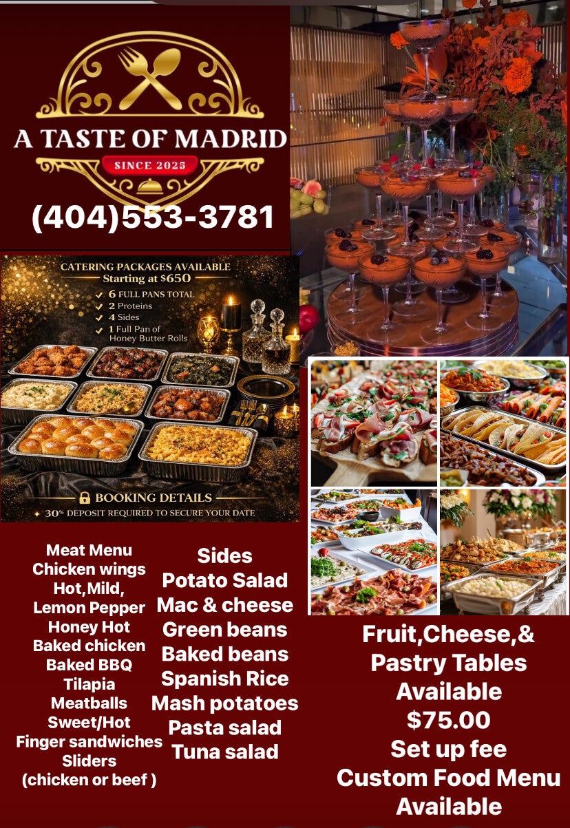 Welcome to A Taste of Madrid, your premier catering service in Dallas,Georgia, proudly serving the greater Atlanta area. We specialize in transforming your events into unforgettable culinary experiences with authentic Mixtures of Food flair. From custom food menus to exquisite pastry and fruit & cheese tables, and even complete party setups and decorations, we handle every detail so you can savor every moment. Let us bring the passion and taste of Madrids Catering to your next celebration!